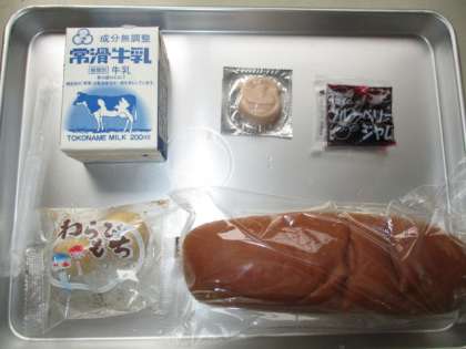 今日の給食は、クロロールパン、牛乳、ブルーベリージャム、型抜きチーズイチゴ、わらびもちでした。
