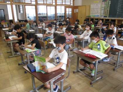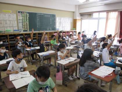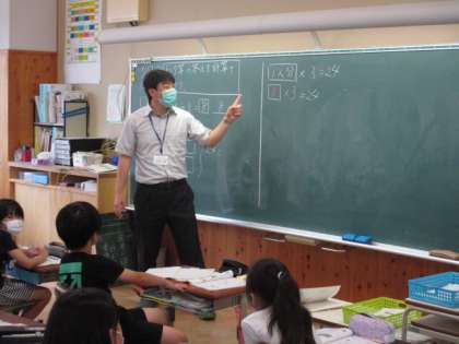 わり算だけど、解くときにかけ算を活用する部分にやや戸惑う児童がいるものの、担任の先生が一人一人に優しく教えていました。