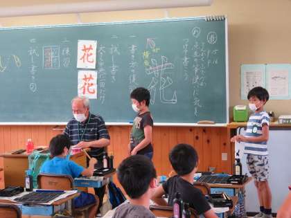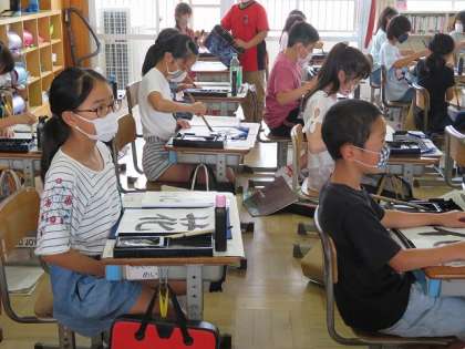 4年生でも書写に取り組んでいました。毛筆で「花」を書いていました。先生に見てもらうときは,2m以上離れて順番を待っています。