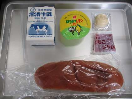 今日の給食は、ミルクロールパン、牛乳、はちみつレモンゼリー、チーズ、いちごジャムでした。