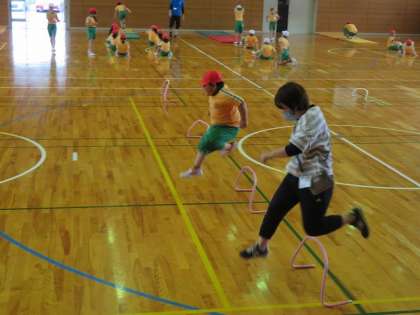 1年生が体育館で,障害物を使った運動遊びをしていました。ミニハードルを上手に飛び越していました。