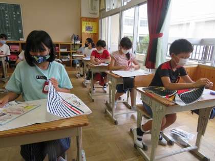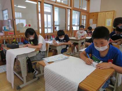 6年2組では,家庭科でナップサック作りに取り組んでいました。縫い代を考え,しっかりチャコペンで縫う線を引いていました。ミシンで縫うのが楽しみですね。