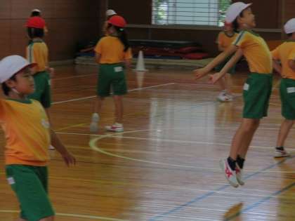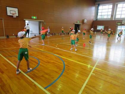 体育館で3年2組が体育をしていました。ビーを投げたり受けたりしました。ドッジビーで狙った相手に投げられるといいですね