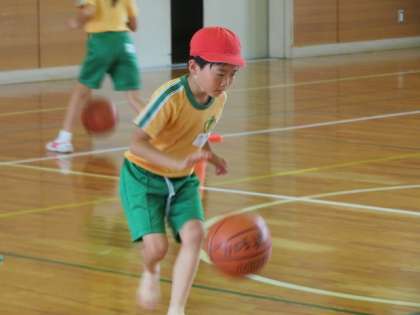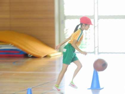 3年3組が体育館でボール運動をしていました。バスケットボールをがんばってついて走っていました。