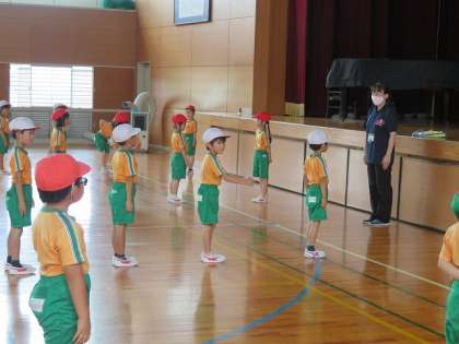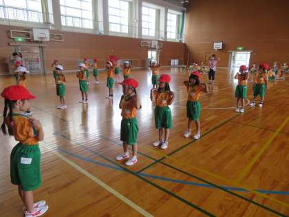1年生が体育館で体操をしていました。しっかり柔軟運動をした後は,ボール遊びをするので,指の運動をしていました。