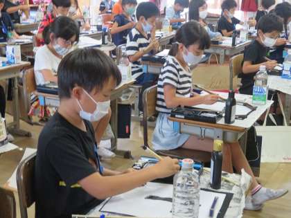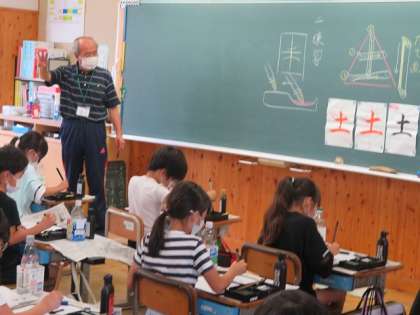 3年3組の書写の様子です。先生から書くポイントを教えてもらいながら,しっかり筆を動かしていました。