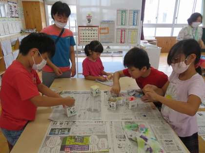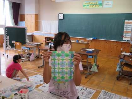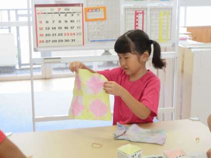 くすのき学級では,折り染めをしていました。しっかり折った和紙に色を染みこませ,開いてみると,すてきな感じに染め上がっていました。