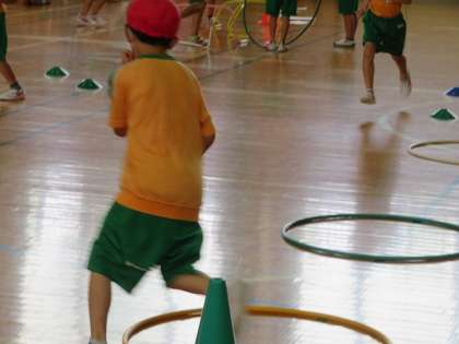 2年3組の体育の授業です。自分たちでコースを考えて,フラフープやコーンを用意し,練習するようです。