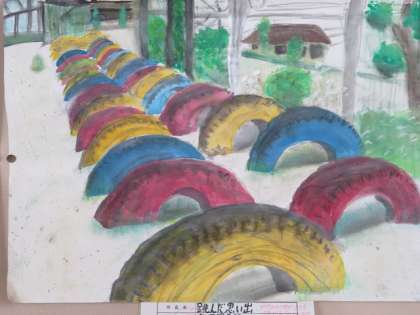 6年生の学年掲示板には図画工作科の時間に描いた絵が掲示してあります。学校の中で自分が好きな場所を選んで,遠近法を使って水彩画にじょうずに表しています。