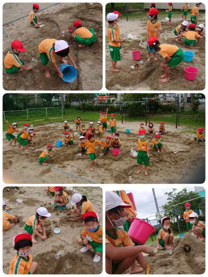 はじめは汚れるのを気にしていた子もいましたが,持ってきたカップを使って作りたい形を作るためにどうしたらいいのか,考えて作っているうちに夢中になっていました。