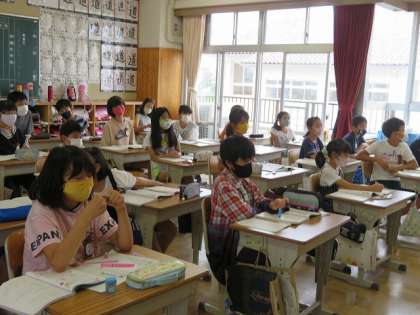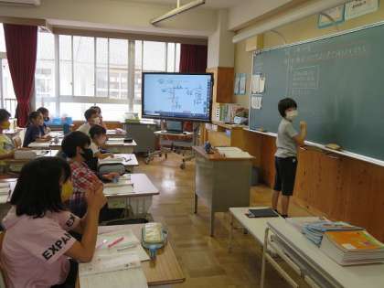 5年2組の算数では,小数の割り算をしていました。あまりのある計算で,あまりが小数になる計算でした。なかなか分かりづらいところなので,みんなで話し合って,正しく計算できるようにしていました。