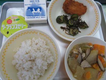 今日の献立は,麦ご飯,一口カツのソースがけ,キュウリの昆布和え,冬瓜汁,ラ・フランスゼリーでした。