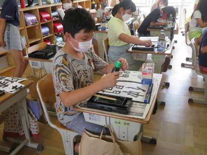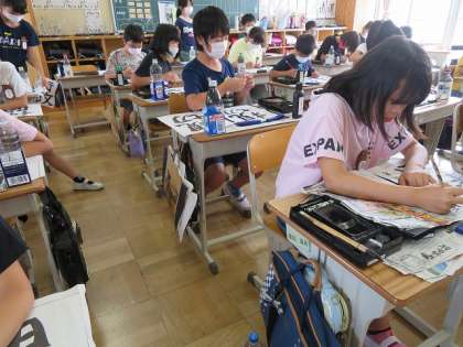 5年2組の書写の時間です。真剣な表情で,筆を動かしていました。