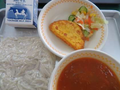 今日の献立は,ソフト麺,ミートソースがけ,オムレツ,コールスローサラダ,牛乳でした。今日も美味しくいただきました。