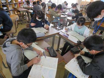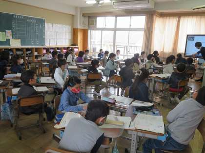4年2組の算数では,分度器で角度を測っていました。いろいろな向きに角が開いているので,分度器の当て方も考えないといけません。