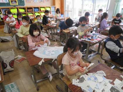 1年2組の図工の時間では,「やぶいた かたちから うまれたよ」に取り組んでいました。まずは,紙を破いて,いろんな形が生まれていました。どんな作品になるか楽しみですね。