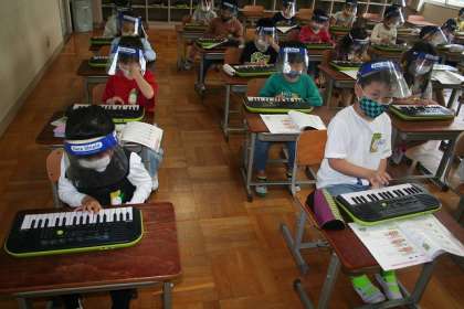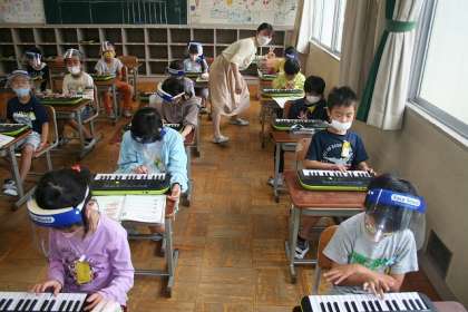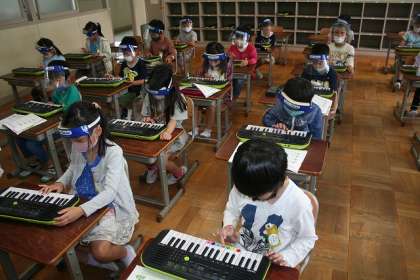 2年生が音楽で、「かえるのがっしょう」のがっそう(合奏)に取り組んでいました。緊急事態宣言のため、歌ったり吹いたりできないので、しばらく音楽はできることを工夫しながら取り組んでいきます。