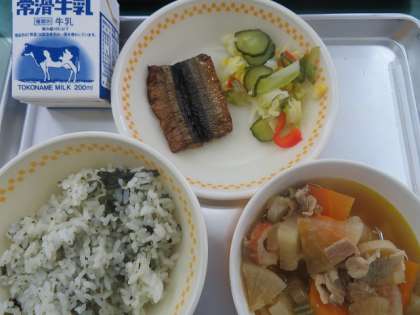 今日の献立は,わかめご飯,サンマみりん焼き,白菜のサワー和え,豚肉と大根の煮物,牛乳でした。今日も美味しくいただきました。