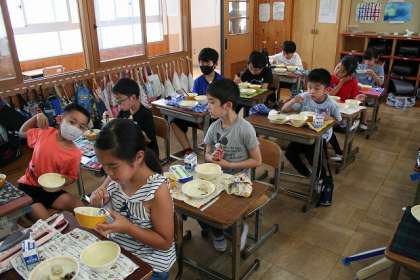 黙々と給食を食べます。昼の放送当番は、放送室で黙々食べます。