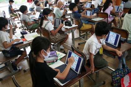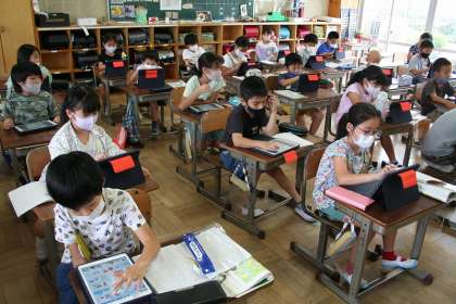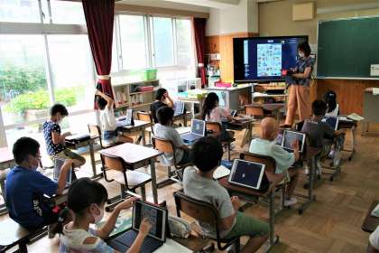 2年1組が国語で,「ことばでみちあんない」の学習をしていました。言葉で道案内された内容を,タブレット上の地図でたどっていました。できたら,データを先生に送ります。