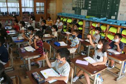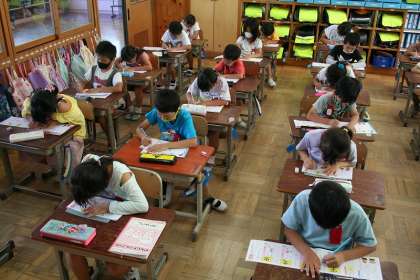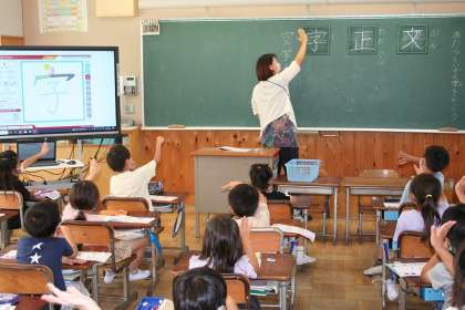 1年1組が国語で,新出漢字の練習をしていました。やはり,まずは書き順ですね。