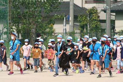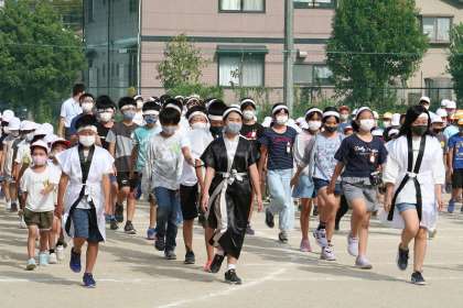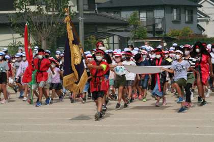 5時間目に,運動会の開会式を行いました。運動会は,色別対抗戦ですので,みんなで明日に向け,気持ちを高めました。入場行進です。