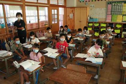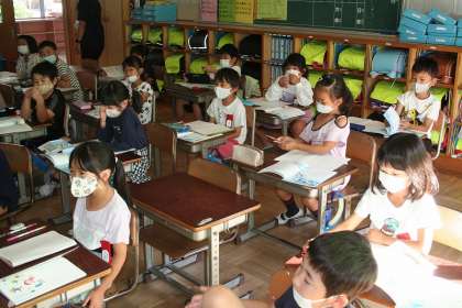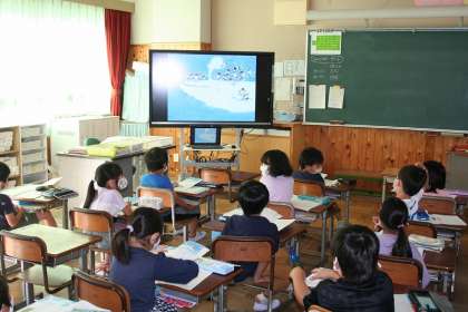 1年3組が国語で,くじらぐもの範読を聞いていました。電子黒板でさし絵も映していました。楽しく感情移入しやすい作品なので,みんなよく聞いていました。