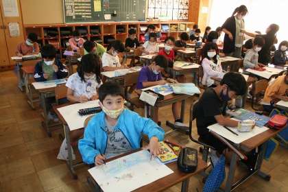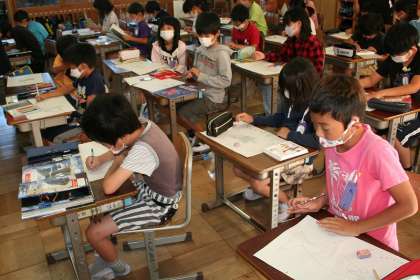 3年2組が図工で,「にじいろのさかな」の物語の絵を描いていました。まだ下書きの段階ですが,上手に描いていました。