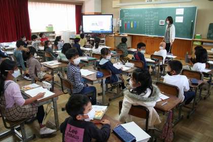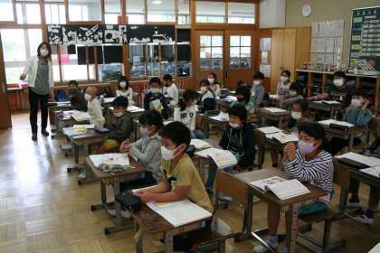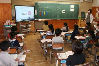 2年1組が算数で,4の段の九九を学習していました。がんばれ!2年生。