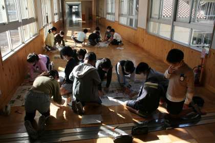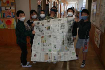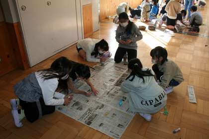 4年1組が,廊下で1平方メートルの広さを,新聞紙で作っていました。実際の広さを体感することは大切ですが,作業が楽しいよね。(3枚目は,冬を感じさせる色になってきました)