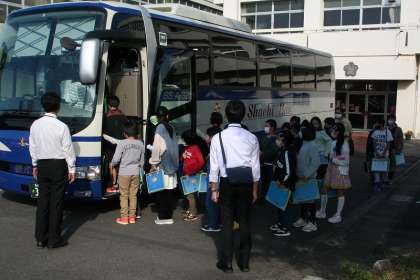 4年生が,東海市にある東邦ガスのガスエネルギー館に見学に出かけました。バスを1台チャーターしていただきましたので,4年生を2チームに分けて見学をします。後半のチームが学校を出発していく様子です。