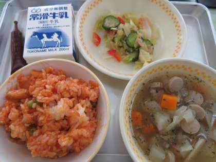 今日の献立は,ご飯,チキンライスの具,赤ピーマンのマリネ,根菜のスープ,ココア牛乳のもと,牛乳でした。洋風メニューで美味しくいただきました。