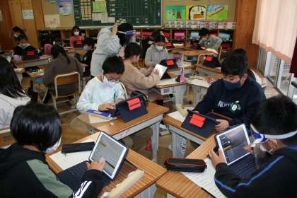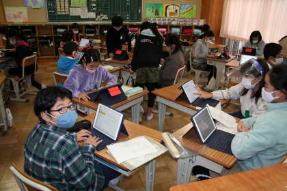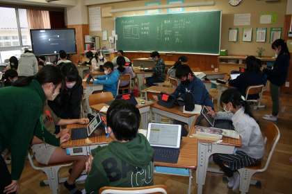 5年2組が,総合的な学習の時間で取り組んでいる「米」について,発表するためのプレゼンテーションを作成していました。手際よく作業を進めていました。
