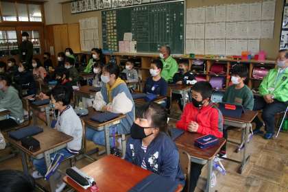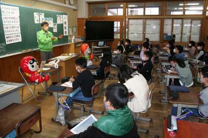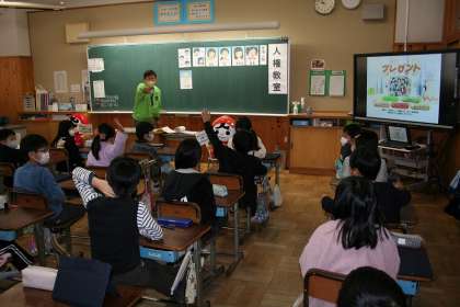 人権擁護委員さんを講師にお迎えして,4年生が「人権教室」を開きました。人権擁護委員さんが先生となり,いじめについてのビデオを見ながら,授業を進めていきます。人権まもる君とあゆみちゃんが見守ってくれました。