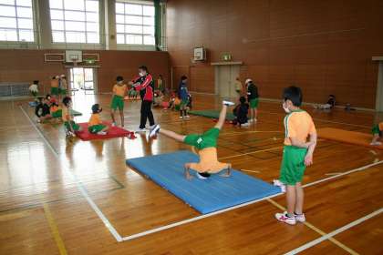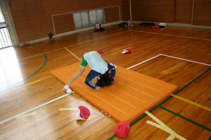 4年2組が体育で,開脚後転の練習をしていました。回転する前の姿勢で、手を耳の横に準備しておくのがポイントです。ケガに気をつけて,がんばろう!