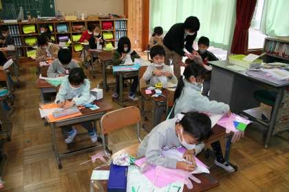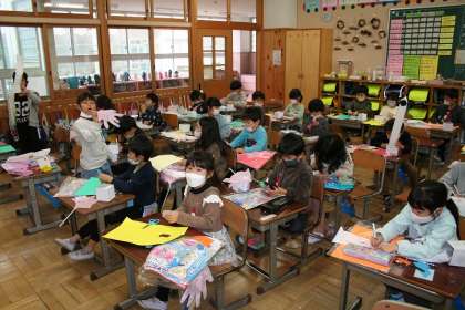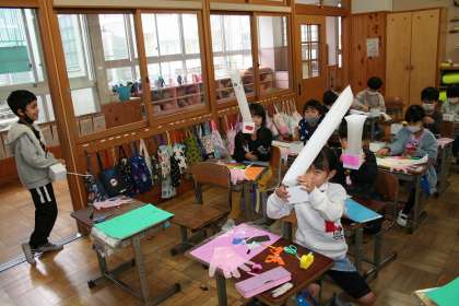 1年3組が図工で,にょきにょき飛び出す作品を作っていました。にょきにょき飛び出す手もあります。今は白い棒が飛び出しますが,完成したら,どんな作品が飛び出すか楽しみです。