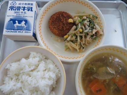 今日の献立は,ご飯,和風コロッケのソースがけ,切り干し大根のサラダ,茎ワカメ入りとり団子汁,牛乳でした。今日も美味しくいただきました。