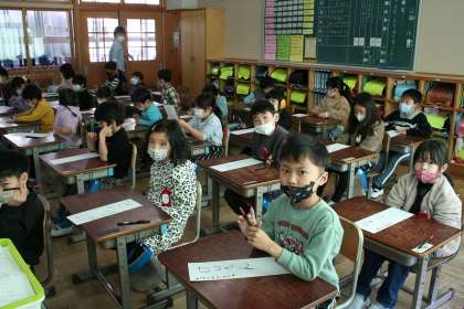 2時間目に,1年生が教室で書き初め会を行いました。1年3組の様子です。