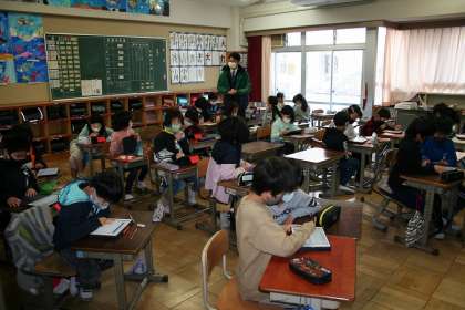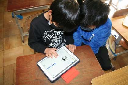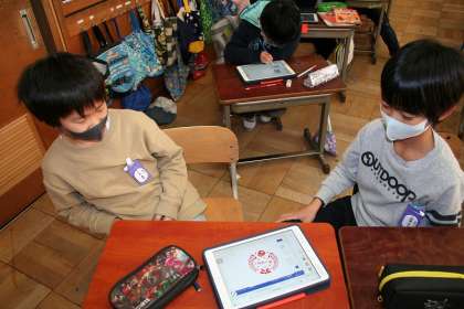 3年3組が国語で,漢字ドリルを使って,新出漢字の練習をしていました。できた子は,タブレットのデジタル教材「ナビマ」を使って,漢字の練習をしていました。正解したら,優勝カップや「あっぱれ」マークが出ます。