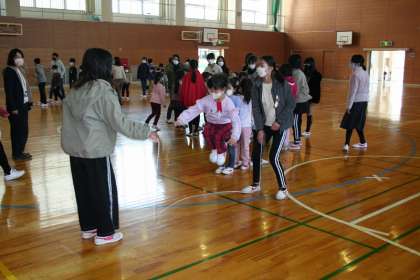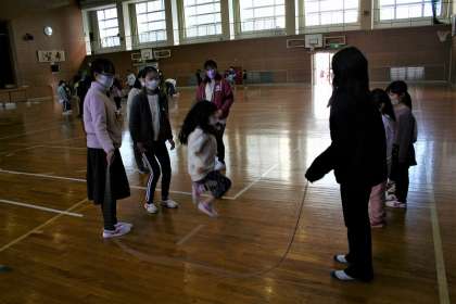 1年2組と6年1組が,ペア学級で8の字とびの練習をしていました。まずは,グループに分かれて練習し,そのまとめとして,男女別で8の字とびをしました。6年生が上手に1年生の支援をしていました。