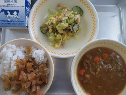 今日の献立は,麦ご飯,カレーライス,ツナサラダ,福神漬け,牛乳でした。今日も美味しくいただきました。