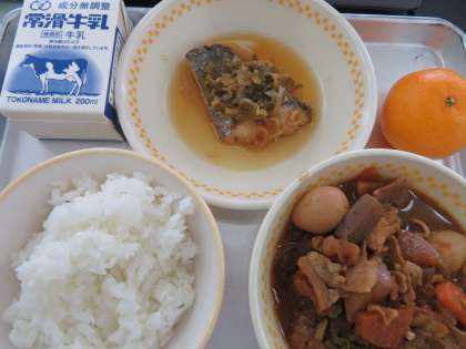 今日の献立は,ご飯,サワラの香味だれかけ,煮味噌,ポンカン,牛乳でした。