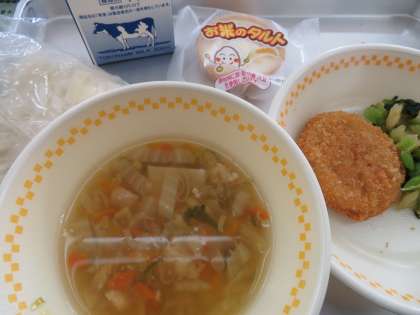 今日の献立は,きしめん,和風かけ汁,レンコンサンドフライ,野菜のおかか和え,お米のタルト,牛乳でした。今週は,知多市学校給食週間です。地元でとれた食材や郷土料理を取り入れた献立になっています。今日も美味しくいただきました。