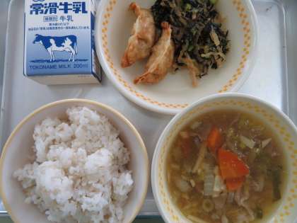 今日の献立は,ご飯,揚げ餃子2個,ひじきと春雨の中華煮,八宝たん,牛乳でした。今日も美味しくいただきました。