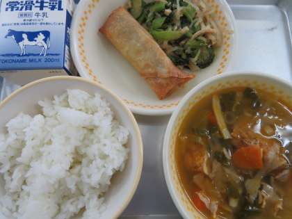 今日の献立は,ご飯,愛知の野菜入り春巻き,バンサンスー,ピリ辛汁,牛乳でした。今日も美味しくいただきました。
