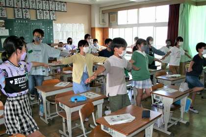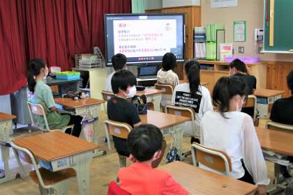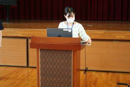 続いて,「子どもロコモになっていませんか?」というテーマで,保健師さんに講話をしていただきました。ロコモ(ロコモティブシンドローム)とは,年齢とともに体の働きがおとろえて,立つ・歩くといった移動する動きがしにくくなった状態を指します。子どもロコモチェックを行い,予防するために子どもロコモ体操を教えていただきました。