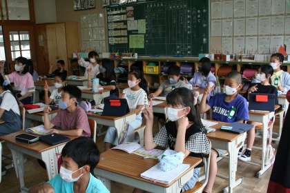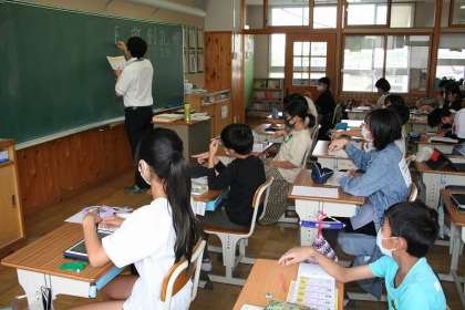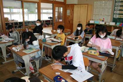 6年1組が国語で,「話し言葉と書き言葉」の単元の新出漢字を練習していました。新出漢字は,1年生も6年生も同じで,書き順チェックから始まります。
