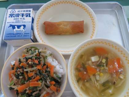 今日の献立は,ご飯,ビビンバ,春巻き,中華コーンスープ,牛乳でした。今日も美味しくいただきました。