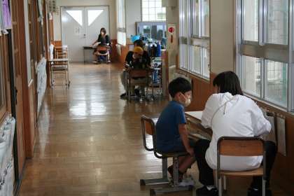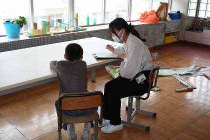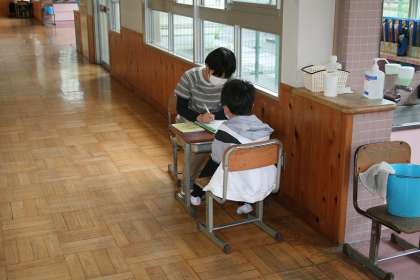 今週は教育相談週間です。40分授業とし,25〜30分の時間を授業後に設け,教育相談として使っています。また,事前に行った「心と体のアンケート」を,相談に役立てています。担任が出張等でいない場合も,学年の下校を統一するため,そのクラスは自習をしています。5時間目が終わった後の,1・2年生の様子です。