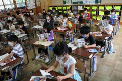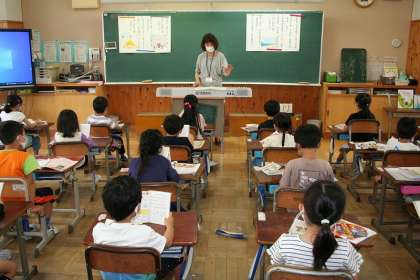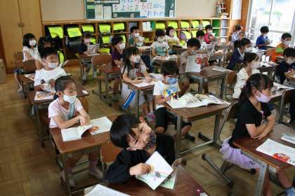1年1組が音楽で,校歌の練習をしていました。明るく感じる曲なので,歌っていて楽しそうでした。校歌は5年先の先輩と5年後の後輩の,合わせて10学年の子どもたちと歌うことになります。人とのつながりや伝統を感じますね。
